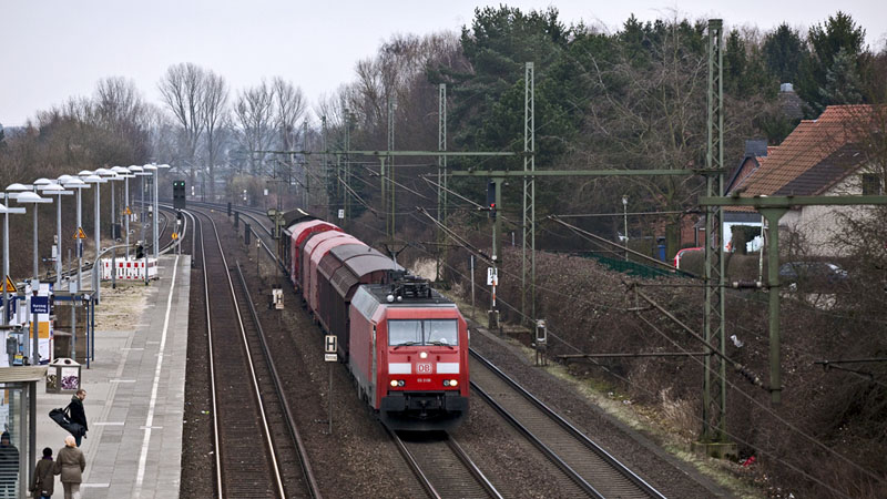 | Die nun errötete EG 3108 hatte nur einen kurzen Güterzug in den Norden zu bringen. Pinneberg-Thesdorf, 18. März 2011 |