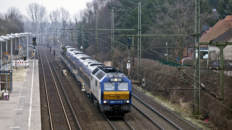 | Die Nord-Ostsee-Bahn nach Westerland (Sylt) mit der DE 2700-07. Pinneberg-Thesdorf, 18. März 2011 |