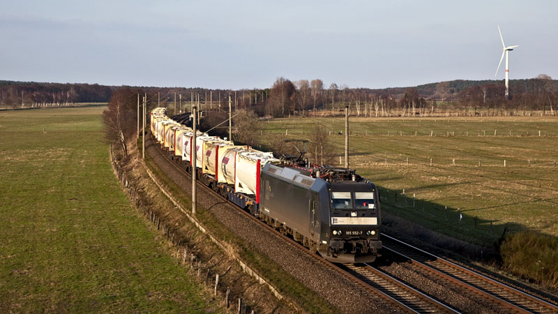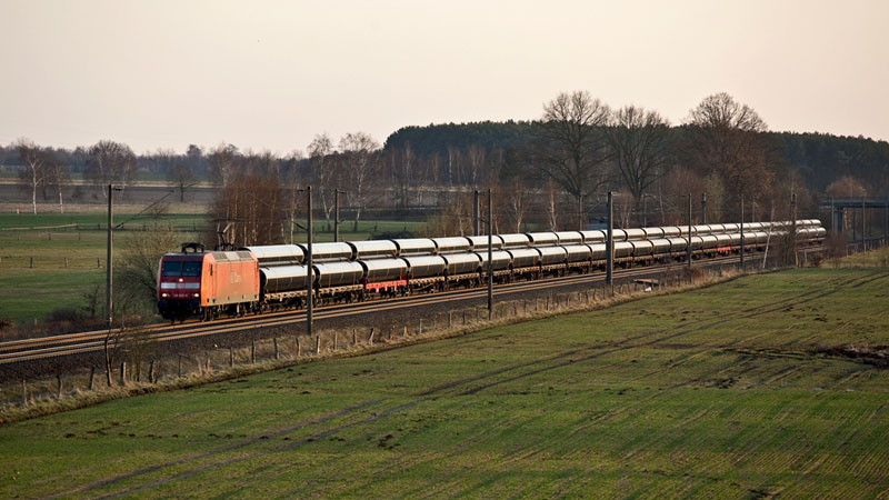 | Der Kalkmehl-Leerzug von Padborg nach Rhodenhaus mit der CFL 185 552-7. Ramelsloh, 29. März 2011 |