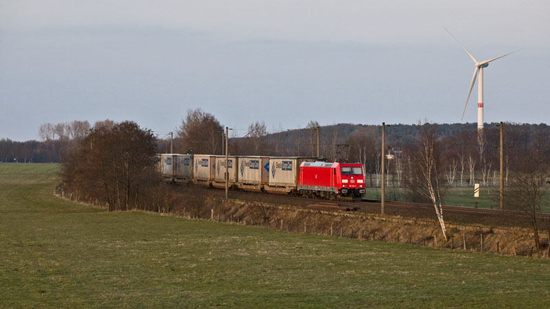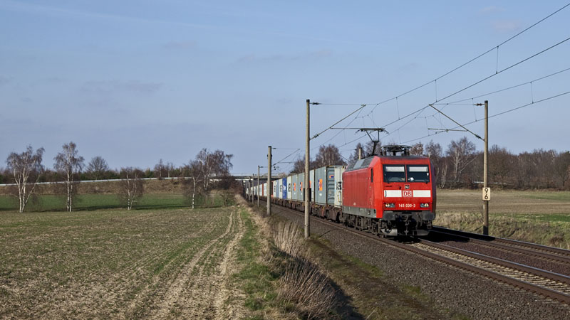 | Eine lange Schlange an Containern hatte die 145 030-3 am Haken. Marxen, 29. März 2011 |