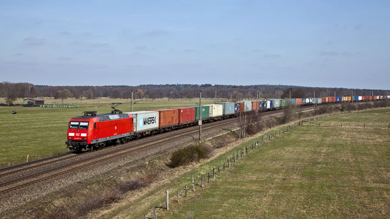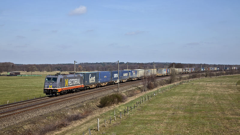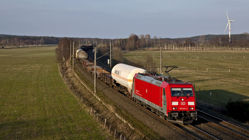| Die 185 403-3 von DB Schenker Rail Danmark A/S mit einem gemischten Güterzug von Maschen. Ramelsloh, 29. März 2011 |