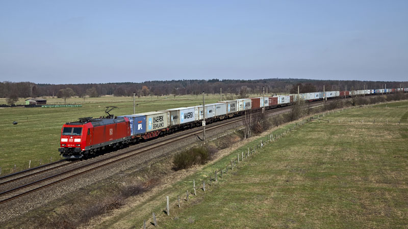 | Ein weiterer Containerzug aus Hamburg mit der recht blitzblanken 145 077-4. Ramelsloh, 29. März 2011 |