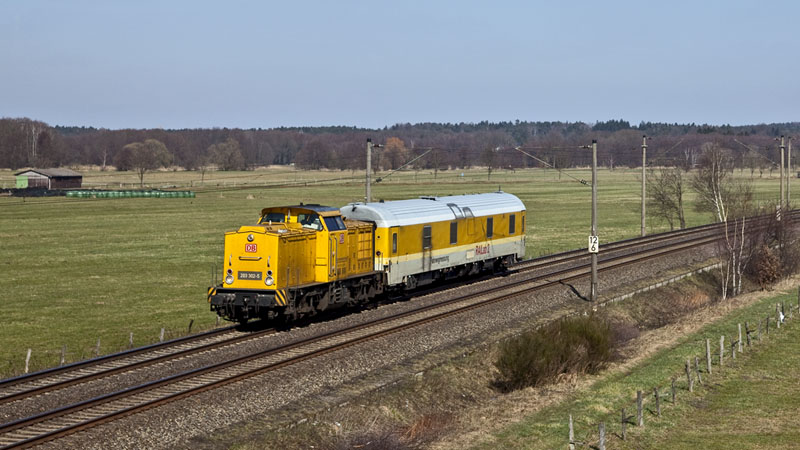 | Den Messwagen "RaiLab 2" hatte die DB Netz 203 302-5 von Hamburg gen Westen zu ziehen. Ramelsloh, 29. März 2011 |