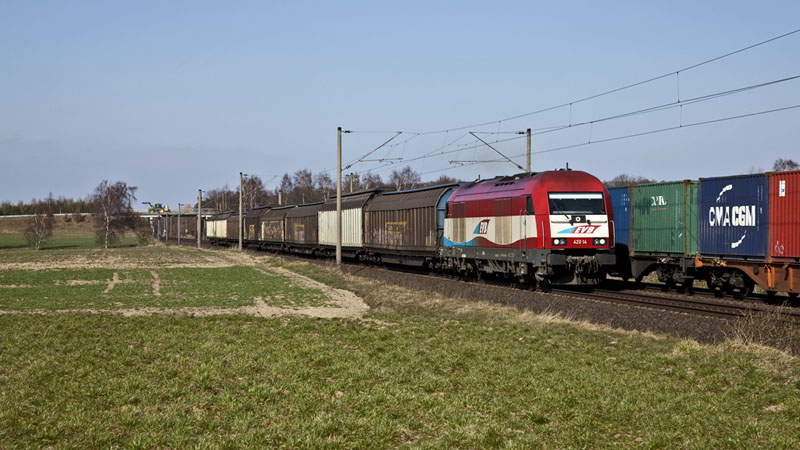 | Begegnung zweier Güterzüge, die EVB 420 14 brachte Schiebewandwaggons in Richtung Buchholz. Marxen, 29. März 2011 |