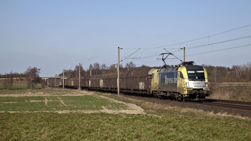 | Die ehemalige boxXpress.de-Lok ES 64 U2-016 mit dem HECTORRAIL-ScandFibre-Zug 45685. Marxen, 29. März 2011 |
