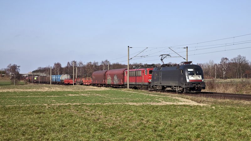 | Die ES 64 U2-014 von MRCEdispolok als DB Fernverkehrslok in DB Schenker-Diensten – im Schlepp hatte sie auch noch die 155 024-3. Marxen, 29. März 2011 | ||