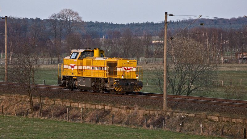| Die starke G1700BB von WIEBE, die Lok Nummer 12 dieselte westwärts. Ramelsloh, 29. März 2011 |