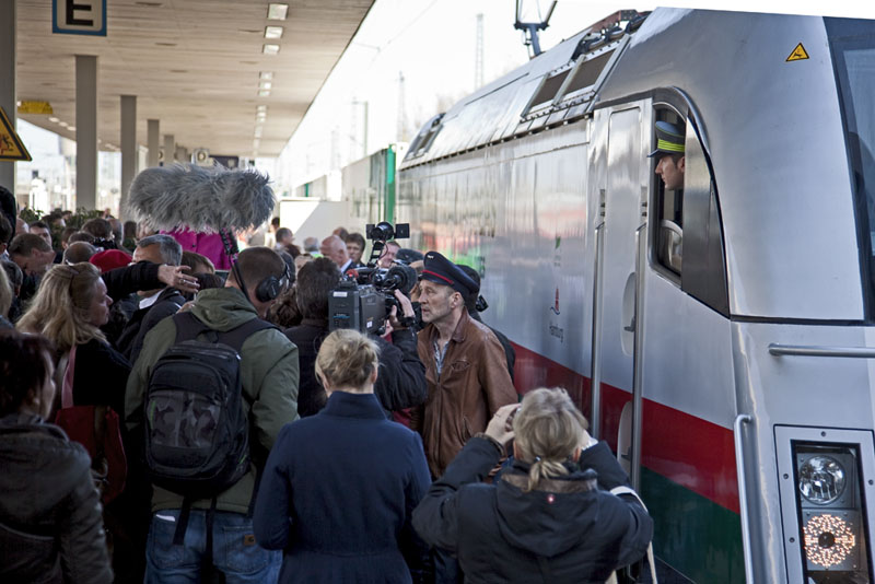 | Während Peter Lohmeyer die Presse "fütterte", pirschte ein Fotograf an den "TRAIN OF IDEAS". Hamburg-Altona, 15. April 2011 |