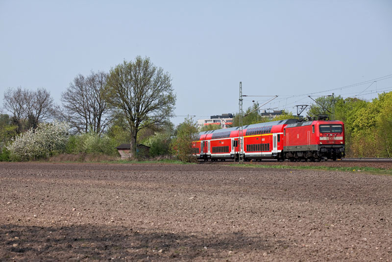 | Eine RegionalBahn nach Hamburg Altona mit der 143 311-9. Halstenbek, 22. April 2011 |