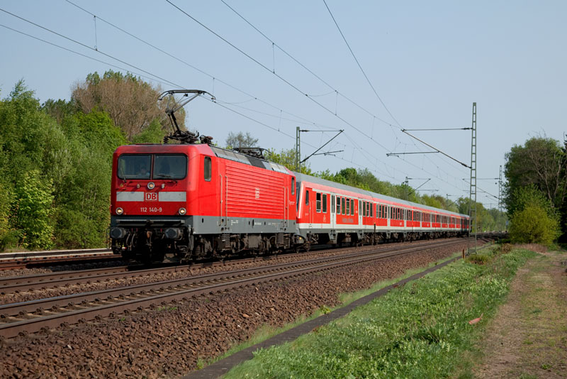 | Außerplanmnmäßig führte die 112 140-9 diese RegionalBahn nach Elmshorn. Halstenbek, 29. April 2011 |