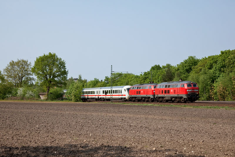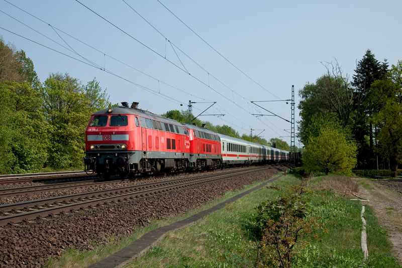 Der InterCity 2171 mit den Dieselloks 218 322-6 + 218 374-7 auf dem Weg nach Hamburg. |