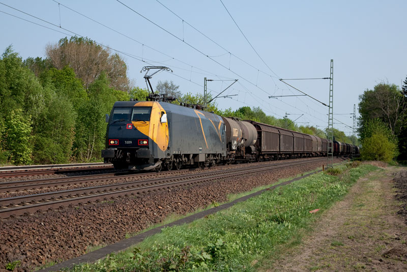 | Schon mit roten Lampenfassungen grummelte die starke EG 3109 mit ihrem schweren Zug gen Norden. Halstenbek, 29. April 2011 |
