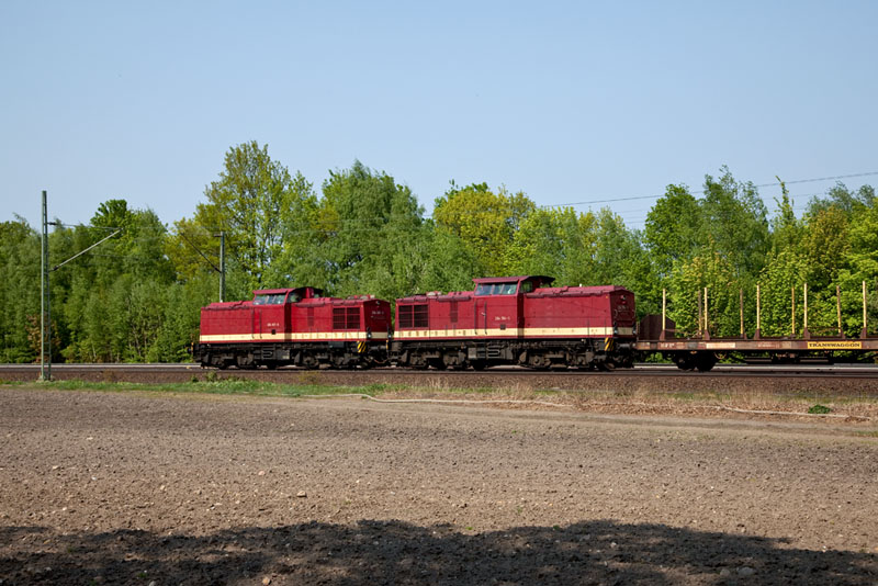 | Die MTEG V100 204 347-9 und 204 354-5 dieselten mit einem Holzleerzug nordwärts. Halstenbek, 29. April 2011 |