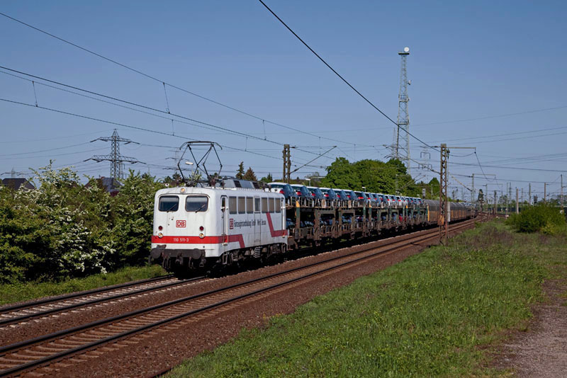 | Die Gewährleistunglok vom Aw Dessau, die 110 511-3 mit einem Autologistikzug der PCT Altmann-Gruppe! Ahlten, 30. April 2011 |