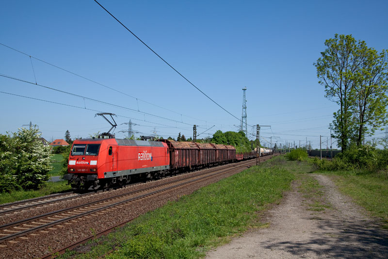 | Die 145 007-1 mit dem alten Railion-Logo vor einem gemischten Güterzug aus Richtung Lehrte. Ahlten, 30. April 2011 |