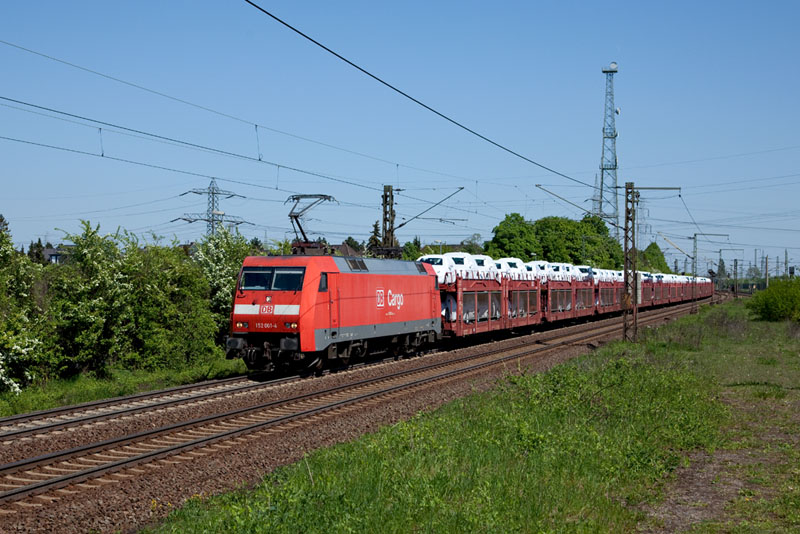 | Nagelneue Autos vom VW-Konzern brachte die 152 001-4 westwärts. Ahlten, 30. April 2011 |
