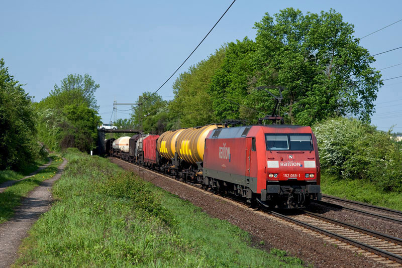 | Hinter der 152 069-1 waren zwei ehemalige DHL-Kesselwagen, als sie mit ihrem Zug ostwärts fuhr. Ahlten, 30. April 2011 |
