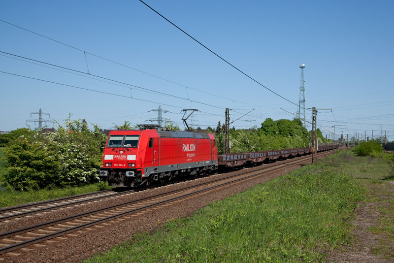 | Mit Stahlbrammen auf schweren Flachwagen rollte die 185 294-6 in Richtung Westen. Ahlten, 30. April 2011 |
