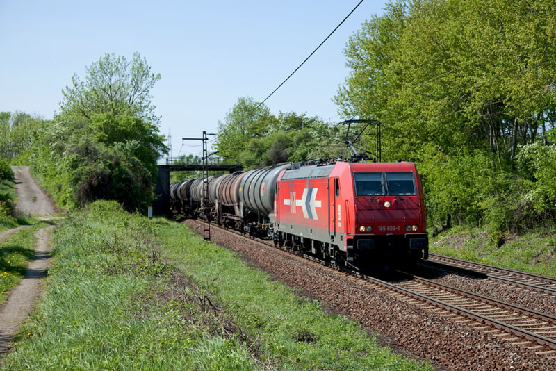| Auch die 185 606-1 der HGK hatte wohl jede Menge "Ökoplörre" namens E10 am Haken… Ahlten, 30. April 2011 |