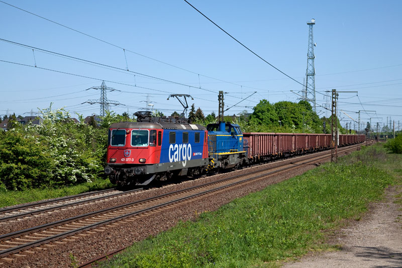 | Diesen Ea-Wagenganzzug wuppten 421 377-3 der SBB Cargo und die V 2305 der MWB gemeinsam. Ahlten, 30. April 2011 |