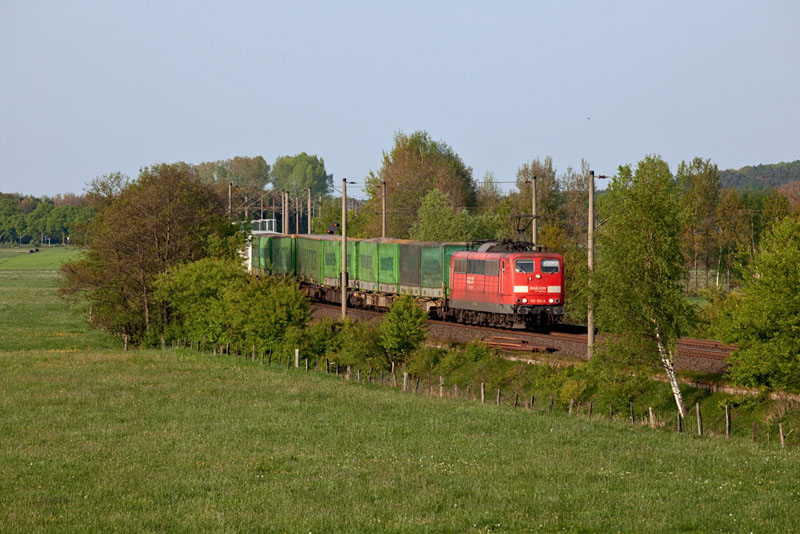 | Dagegen hatte die Schwesterlok 152 151-7 einen Containerzug aus dem Hamburger Hafen. Ramelsloh, 5. Mai 2011 |