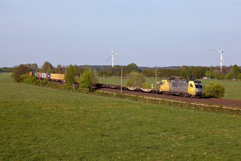 | Einen Containerzug hatte die ES 64 U2-096 mit IBS-Werbung am Haken. Ramelsloh, 5. Mai 2011 |