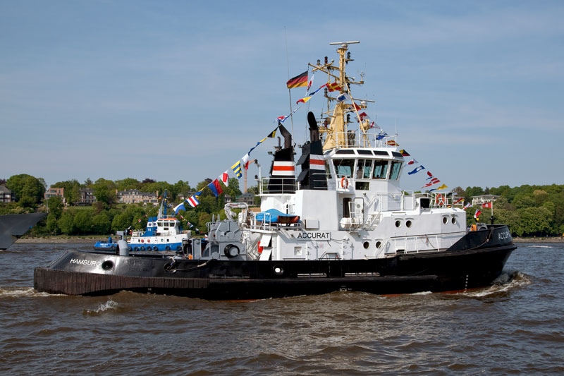 | Auch der Hafenschlepper ACCURAT der Hamburger Schleppreederei Lütgen & Reimers war dabei. Hamburg-Waltershof, 6. Mai 2011 |