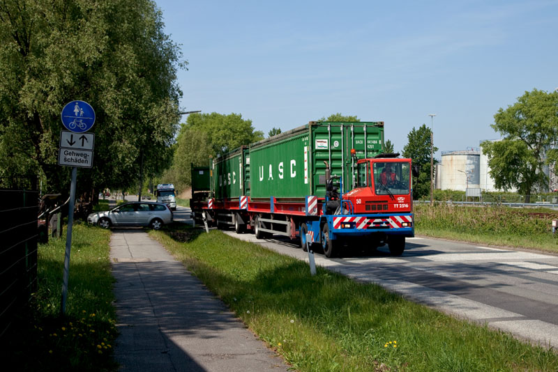 Ein Hamburger "RoadTrain"! Hier fahren spezielle LKWs mit drei Anhängern zwischen den Terminals. |