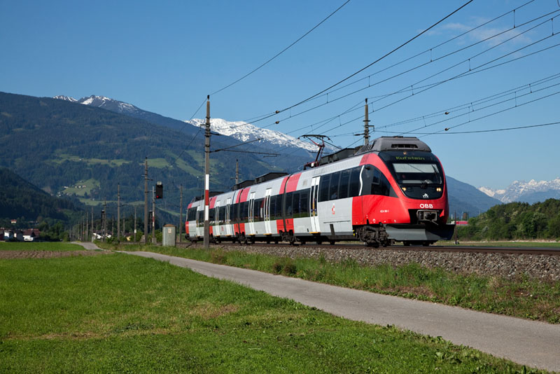 | Die im Stundentakt verkehrende Tiroler S-Bahn in Form der 4024 086 nach Kufstein. Vomp (Inntal), 19. Mai 2011 |