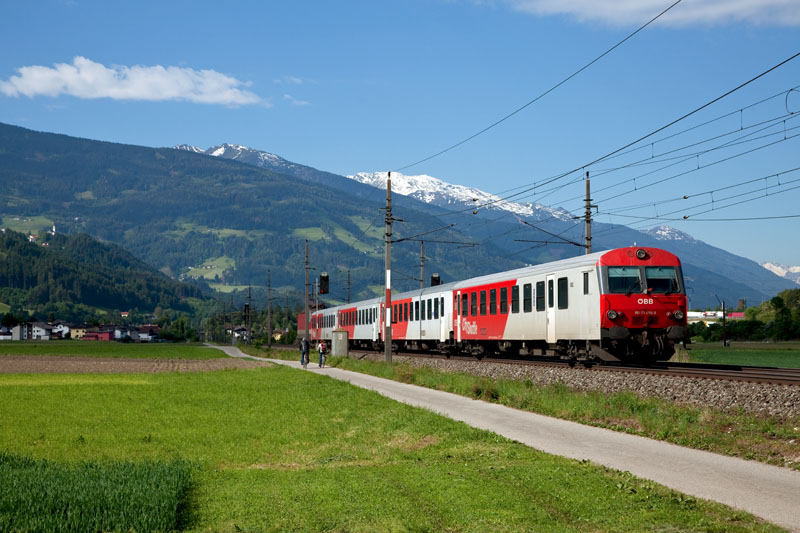 | Der REX von Innsbruck nach Wörgl mit einer geschobenen CityShuttle-Garnitur. Vomp (Inntal), 19. Mai 2011 |