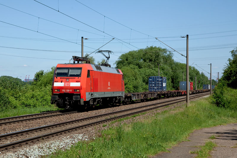 | Einen recht leeren Containerzug hatte die 152 159-0 am Haken. Hamburg-Moorburg, 4. Juni 2011 |