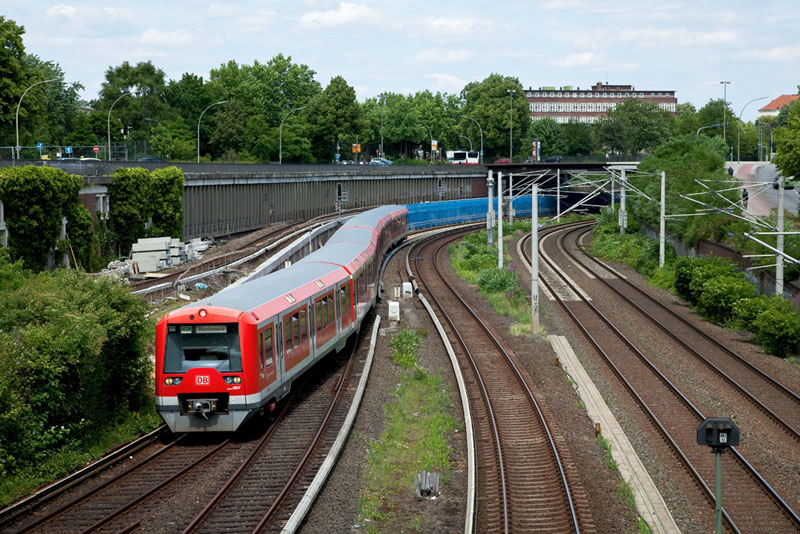 | Eine einfahrende S1 nach Blankenese mit den beiden Triebzügen 474 028 und 474 045. Hamburg | Berliner Tor, 13. Juni 2011 |