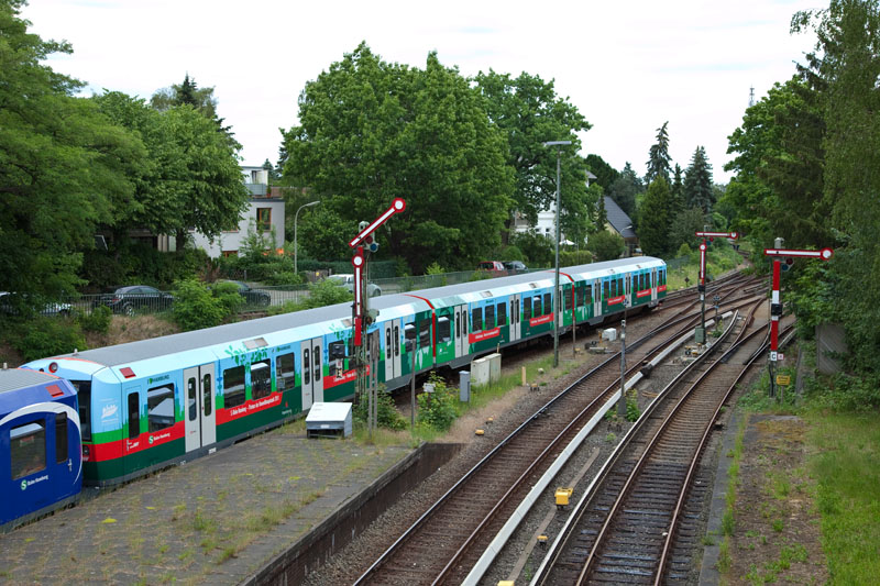 | Der Kopfbahnhof Blankenese mit zwei Vollzügen der S1 – rechts natürlich das Werbe-Doppel. Hamburg-Blankenese, 13. Juni 2011 |
