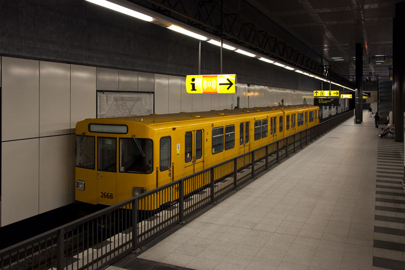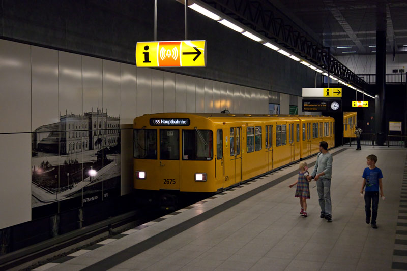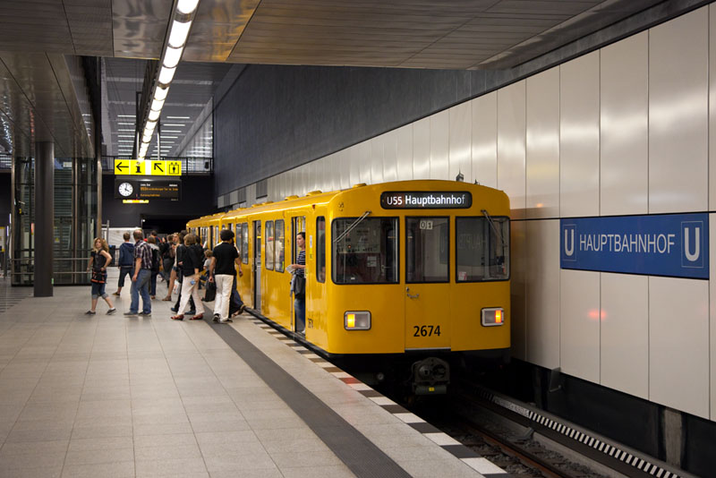 | Die "Kanzler-U-Bahn" U55 hat nur drei (!) Stationen – der Triebwagen 2674/2675 hatte heute Dienst. Berlin Hauptbahnhof, 17. Juni 2011 |