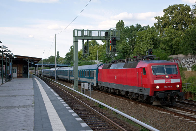 | Leider war die Sonne weg, als der EN 477 "Metropol" nach Budapest mit der 120 145-8 durchfuhr. Berlin | Südende, 17. Juni 2011 |