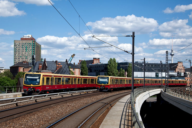 Ein- und ausfahrende Achtwagen-Vollzüge der BR 481/482 auf der S5 nach Westkreuz und Strausberg-Nord. |