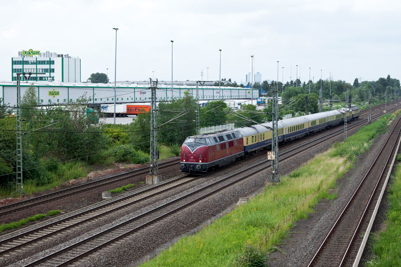 | Die schöne V 200 116 mit dem Rheingold-Zug von Köln nach Warnemünde! Hamburg-Billwerder Moorfleet, 23. Juni 2011 |