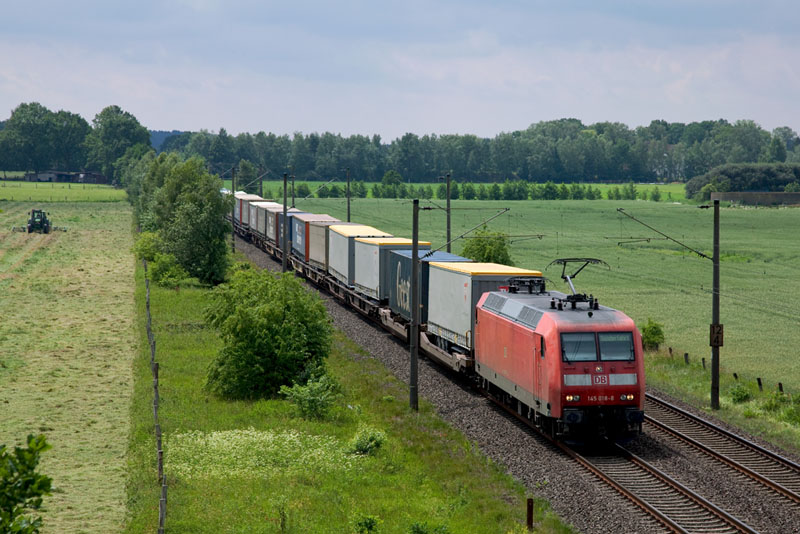 | Während der Bauer seinen Heu wendete, rauschte die 145 018-8 mit ihrem KLV-Zug gen Maschen durch. Ramelsloh, 25. Juni 2011 |