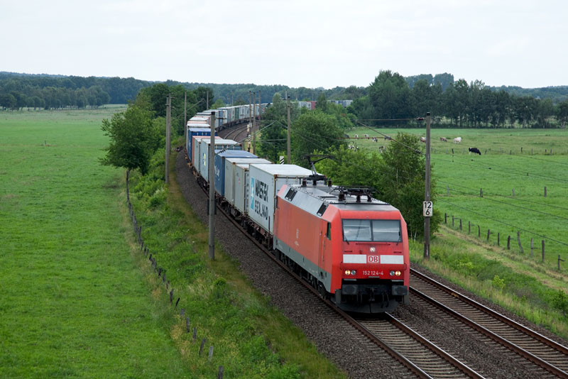 | Die 152 124-4 hatte einen sehr langen Containerzug aus Hamburg zu wuppen. Ramelsloh, 25. Juni 2011 |