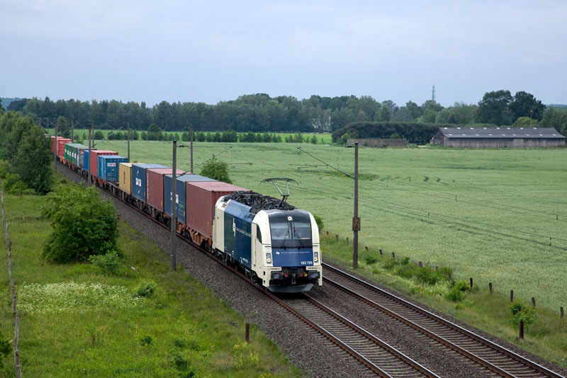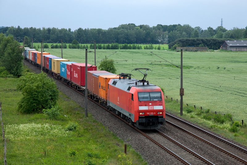 | Container, Container… Hamburgs Hafen ist all'mächtig – hier die 152 153-3. Ramelsloh, 25. Juni 2011 |