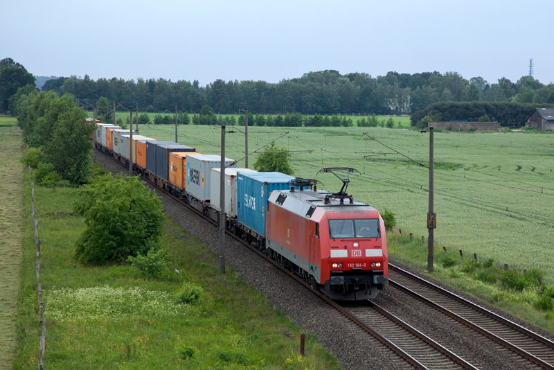 | Auch die 152 164-0 musste jede Menge Container nach Hamburg bringen. Ramelsloh, 25. Juni 2011 |