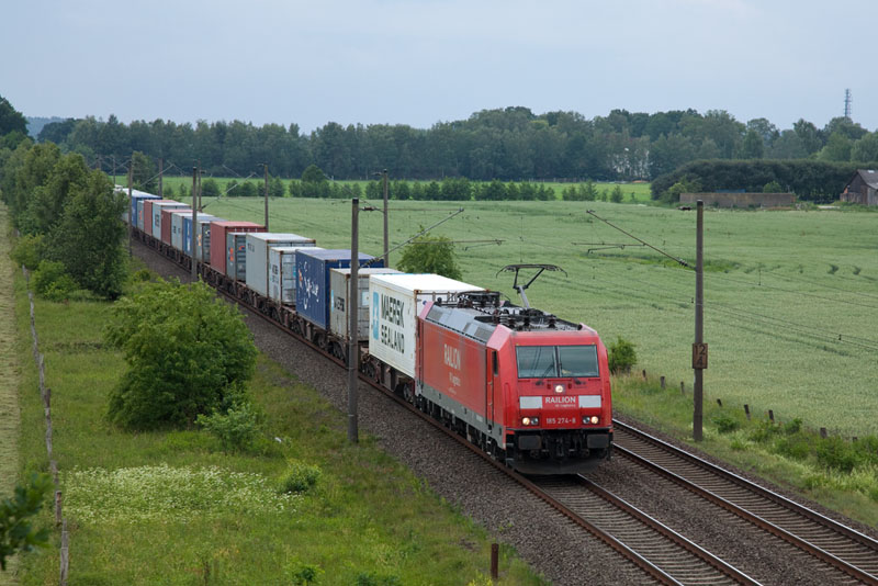 | Noch mehr Seekisten hatte die 185 274-8 nach Hamburg zu bringen. Ramelsloh, 25. Juni 2011 |