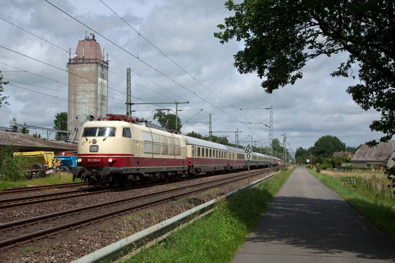 | Pünktlich kam der historische InterCity 2417 "Hanseat" von Flensburg nach Köln mit der 103 235-8. Brokstedt, 26. Juni 2011 |