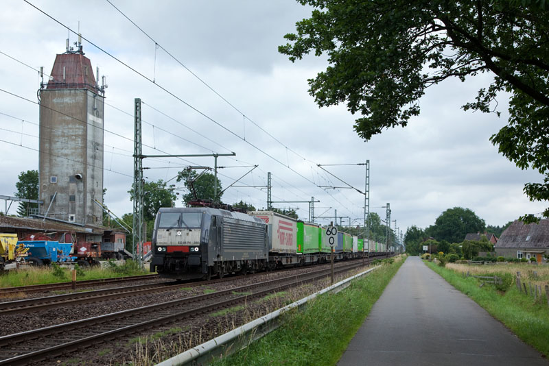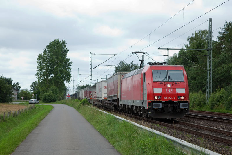 | Als Beispiel für die Züge aus Maschen die 185 324-8 mit ihrem KLV-Zug nach Schweden. Brokstedt, 26. Juni 2011 |