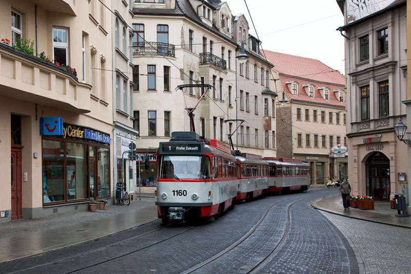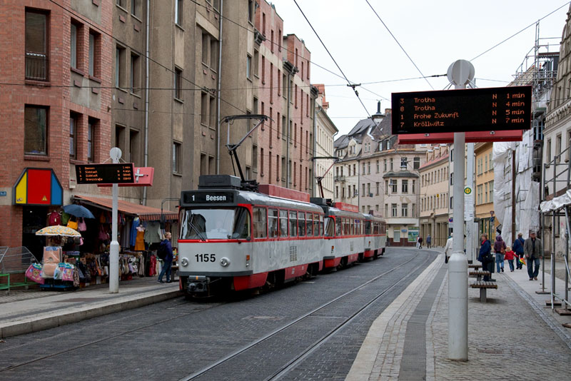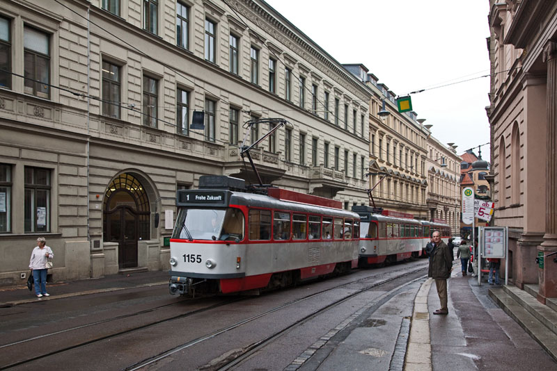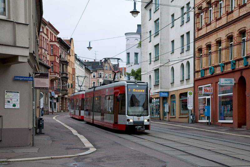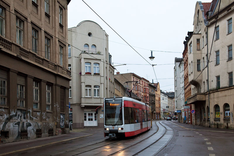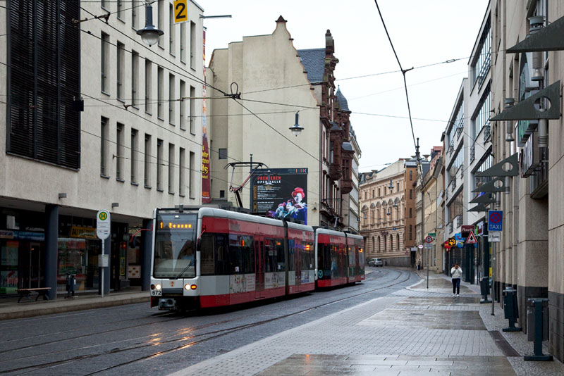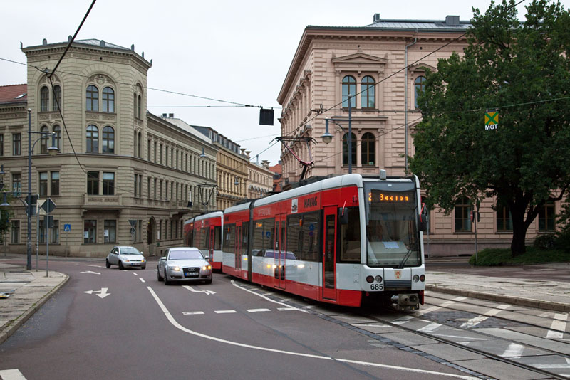 | Die Linie 1 nach Beesen mit dem führenden Triebwagen 672. Halle (Saale) | Große Steinstraße, 3. Juli 2011 |