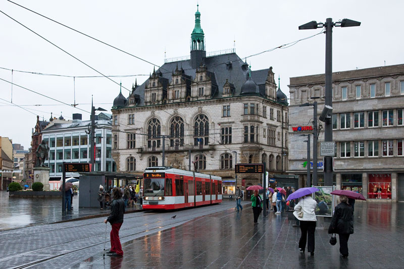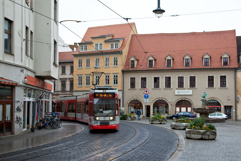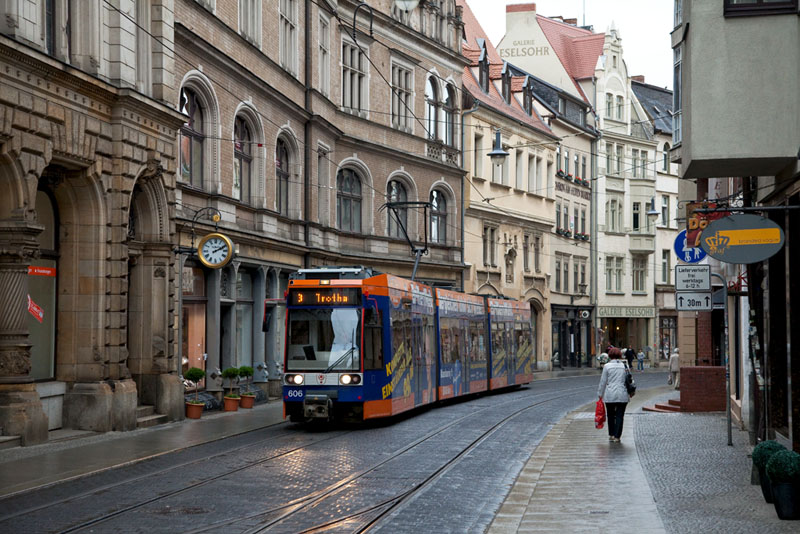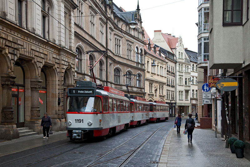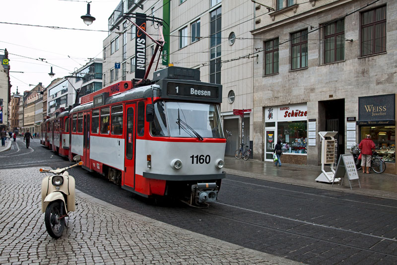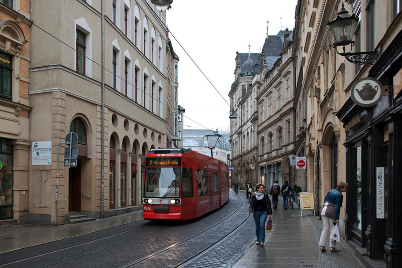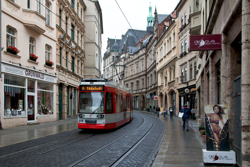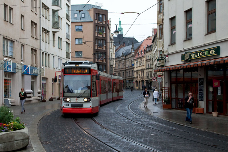 | Die Linie 2 nach Beesen biegte vom Marktplatz kommend in die Gr. Steinstraße ein. Halle (Saale) | Große Steinstraße, 4. Juli 2011 |