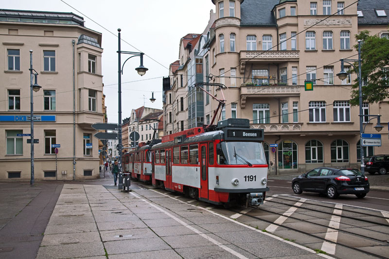 | Nach Beesen ging dieser nächste Kurs mit den Tatras 1191, 1147 und 180 auf der Linie 1. Halle (Saale) | Joliot-Curie-Platz, 4. Juli 2011 |