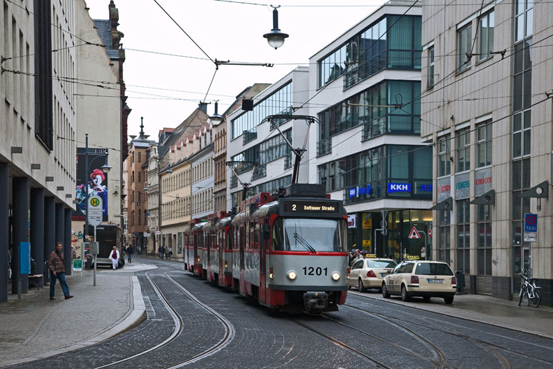 | Tw 1211, Tw 1153 und Bw 206 bildeten den nächsten Großzug auf der Linie 2 nach Beesen. Halle (Saale) | Große Steinstraße, 4. Juli 2011 |