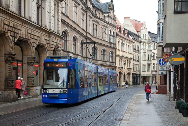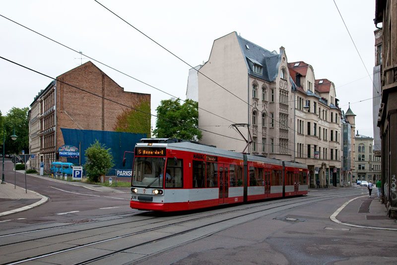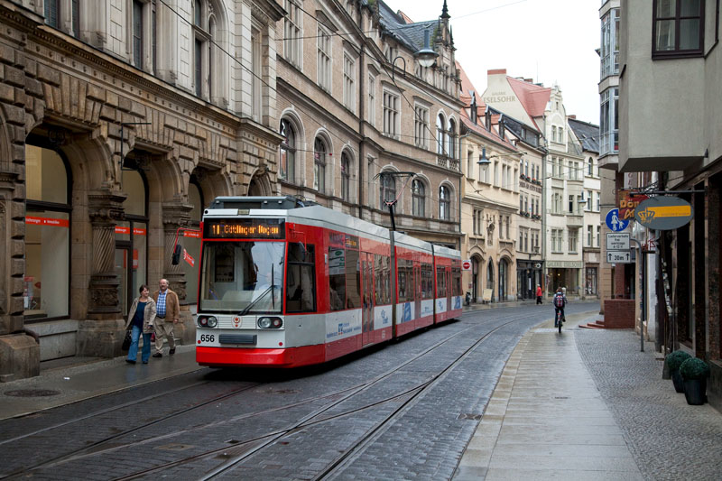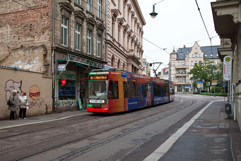 | Der Niederflurtriebwagen 656 auf der Linie 11 zum Göttinger Bogen. Halle (Saale) | Schmeerstraße, 4. Juli 2011 |