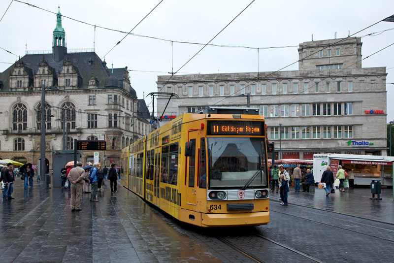 | Nach dem dortigen Fahrgastwechsel beschleunigte Tw 634 auf der Linie 11 zum Göttinger Bogen. Halle (Saale) | Marktplatz, 4. Juli 2011 |